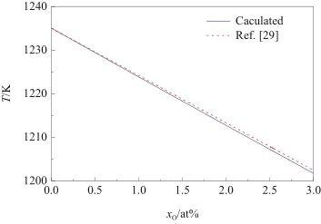 根據(jù)式(23)計(jì)算了Ag-O系的液相線,結(jié)果如圖2所示。從圖中可以觀察到,理想溶體近似模型的計(jì)算值與實(shí)驗(yàn)相圖[29]非常吻合。因此,可以將Ag-O系視為理想溶體。