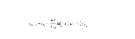 由式(12)和(13)可以看出,Butler方程計(jì)算較為復(fù)雜。考慮液態(tài)氧的表面張力很小[14],可以認(rèn)為γO≈0。另外,由于Ag-O系中O原子數(shù)遠(yuǎn)小于Ag原子數(shù)[29],可以將Ag-O溶體視為理想溶體。此時,GE,b=G=G=0。根據(jù)文獻(xiàn)[18],當(dāng)式(12)所示的Butler方程用于描述理想溶液時,通過假設(shè)系統(tǒng)內(nèi)兩組分具有相等的摩爾表面積,可以得到改進(jìn)的Butler方程。這個改進(jìn)的Bulter方程能夠推導(dǎo)出Gibbs吸附方程和Langmuir方程,被認(rèn)為是表面張力和溶液吸附的根本方程。因此,令A(yù)Ag=AO,將式(12)變換為: