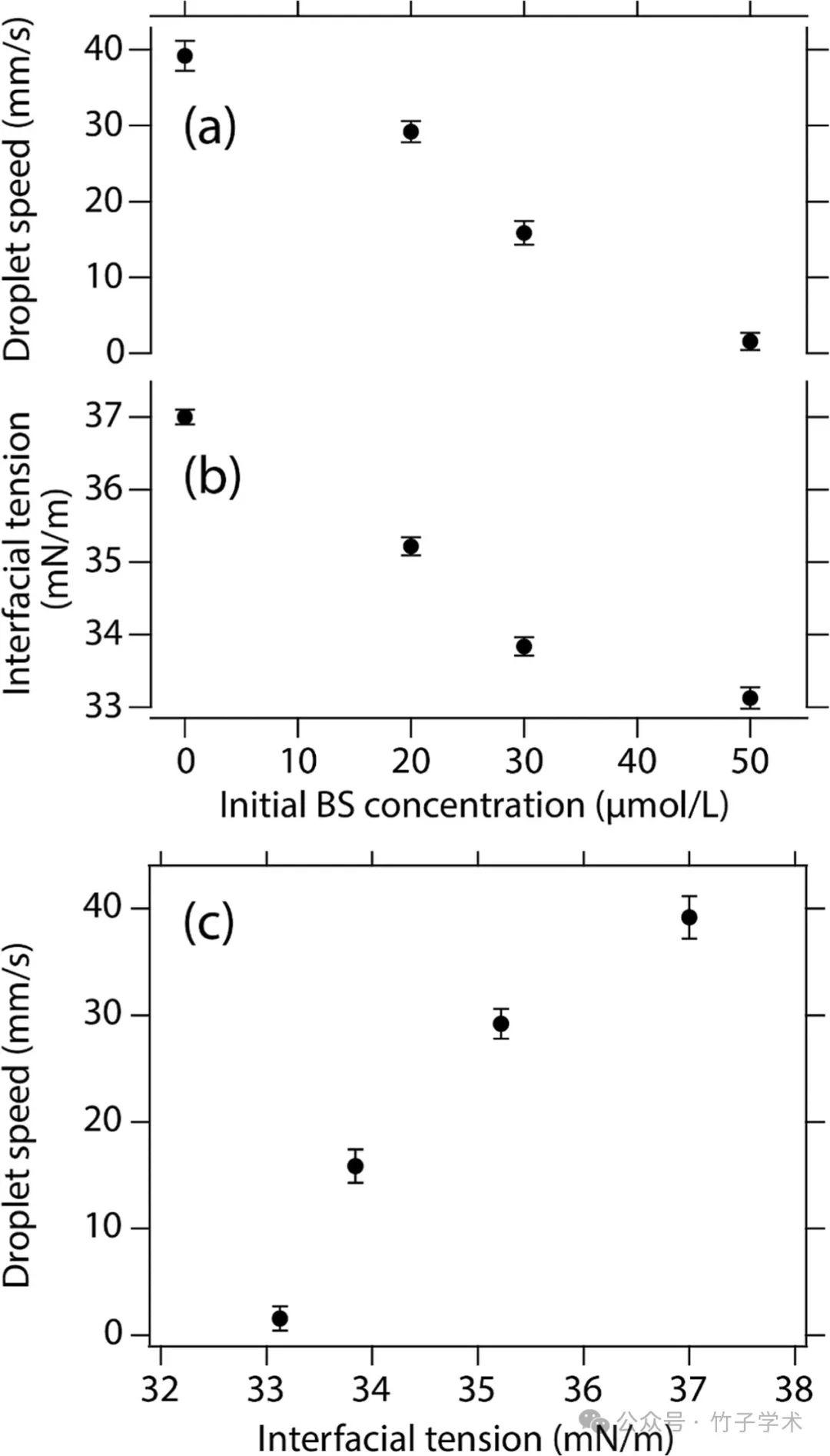 圖2(a,b)液滴速度、平衡界面張力(空氣/液體)和初始BS濃度之間的關系。(c)結果(a,b)中液滴速度與平衡界面張力(空氣/液體)之間的關系。