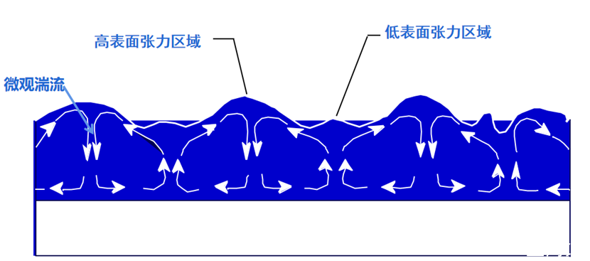 在液相涂層,在漆膜干燥過(guò)程中存在著微觀(guān)湍流。先干區(qū)域往往更多表現(xiàn)為樹(shù)脂本身的表面張力,液相部分還是保持有機(jī)硅或者氟添加劑的表面張力。低表面張力的液態(tài)部分會(huì)有強(qiáng)烈的向高表面張力的區(qū)域遷移的傾向,這樣的效果累積起來(lái)就會(huì)容易出現(xiàn)橘皮或者波浪紋!