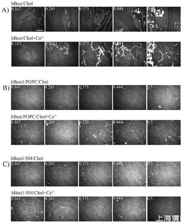 圖2.(A)hBest1/Chol單分子層、(B)hBest1/POPC/Chol(C)hBest1/SM/Chol單分子層的BAM圖像(摩爾分?jǐn)?shù)為Chol 0.167;0.285;0.375;0.444和0.5)Ca 2+的存在與否,在35±2°C。白色比例尺=100μm。