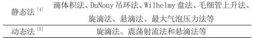 液體表面張力可以通過(guò)儀器測(cè)定,目前測(cè)定方法大體上分為動(dòng)態(tài)法和靜態(tài)法。這兩大類方法下面由于細(xì)分,具體分類如表1。