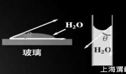 在實(shí)際工作中,通常會(huì)用到接觸角結(jié)合γg-l氣-液界面張力來(lái)判斷鋪展過(guò)程是否自動(dòng)進(jìn)行。接觸角,是指在固相、液相、氣相這三相的交界點(diǎn),兩個(gè)界面張力(氣-固界面與氣-液界面)之間的夾角,通常用θ表示。如圖1,將水滴滴到玻璃上,接觸角如圖所示。