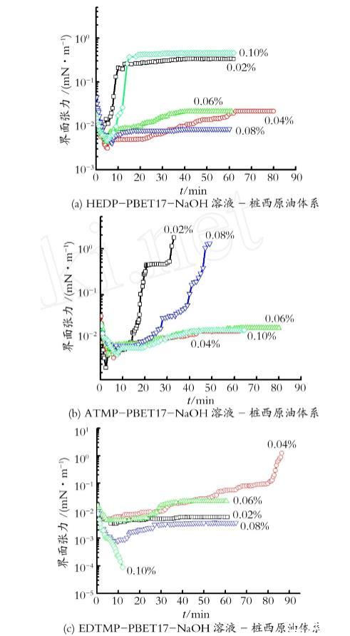 圖5 HEDP-PBET17-NaOH,A TM P-PBET17-NaOH,EDTM P-PBET17-NaOH溶液-樁西原油體系的動態(tài)界面張力
