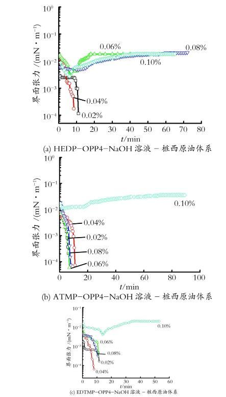 圖4 HEDP-OPP4-NaOH,A TM P-OPP4-NaOH,EDTM P-OPP4-NaOH溶液-樁西原油體系的動態(tài)界面張力