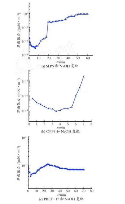 圖2 SLPS,OPP4和PBET-17與NaOH復配-樁西原油體系油-水動態(tài)界面張力