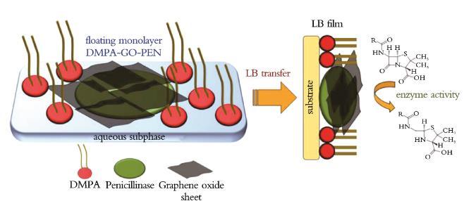 此外,將經(jīng)典兩親分子的Langmuir單層與酶結(jié)合是保持生物大分子催化性能的一種方式。F.A.SCHLL等研究了磷脂LB膜固定化青霉素酶(PEN),將GO加入青霉素酶‐脂質(zhì)Langmuir單層膜中,并作為LB膜轉(zhuǎn)移到固體載體上,評估了酶的催化性能(見圖3)。結(jié)果表明,GO作為由2,2‐二羥甲基丙酸(DMPA)和PEN組成的LB膜的添加劑,被固定在LB膜的PEN中;GO存在于酶脂LB膜中,不僅可以調(diào)節(jié)青霉素酶的催化活性,而且有助于數(shù)周后仍保持其酶活性。研究結(jié)果加強(qiáng)了混合納米結(jié)構(gòu)薄膜的重要性,證明了使用由脂質(zhì)、GO和酶組成的LB膜應(yīng)用于光學(xué)生物傳感器的可行性,對應(yīng)用傳感器的生物電子設(shè)備研究具有重要意義。