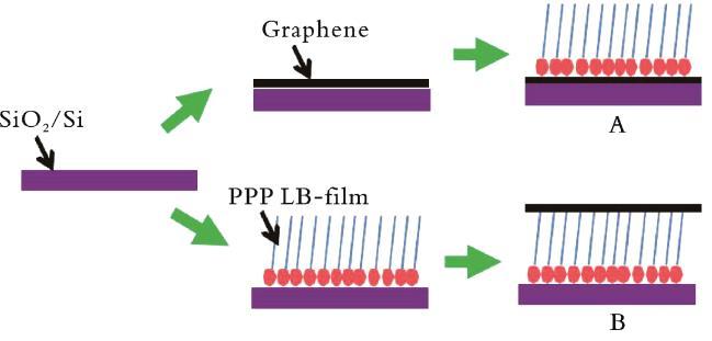 石墨烯作為一種新型二維超薄碳材料,易于吸附分子,是天然的襯底。當(dāng)某些分子吸附在石墨烯表面時(shí),分子的拉曼信號會得到明顯的增強(qiáng),這種拉曼增強(qiáng)效應(yīng)被稱為石墨烯增強(qiáng)拉曼散射效應(yīng)(GERS)。X.LING等為了進(jìn)一步證實(shí)GERS中的化學(xué)增強(qiáng)機(jī)制,使用LB技術(shù)構(gòu)建了原卟啉Ⅸ(PPP)的單層或多層有序聚集體以及與石墨烯接觸的PPP的可控分子構(gòu)型(見圖1)。