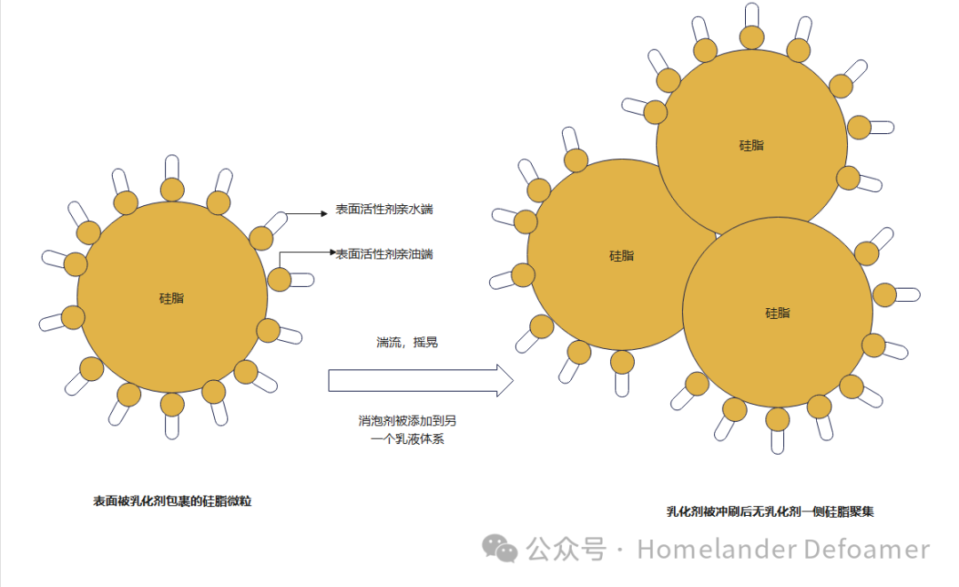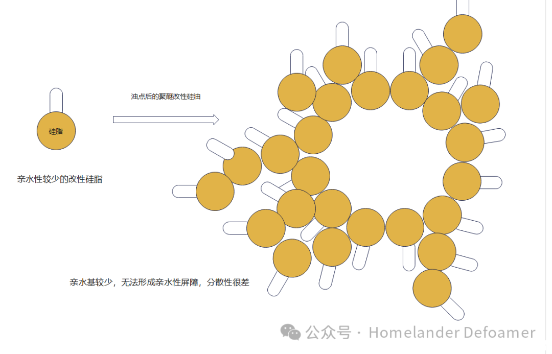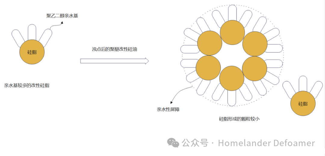乳化劑既然很容易脫落,那么可以用化學(xué)鍵的方式,把乳化劑接枝在硅脂上,這樣即使析出,在沒有外加乳化劑和剪切力的情況下也能將析出的硅脂分散到體系中。這對(duì)親水基與親油基分子量的把控極其重要。若親水基太大,形成水包油的顆粒太小,雖然不析出。但是太小的微粒排液時(shí)間久,消泡速度就很慢。