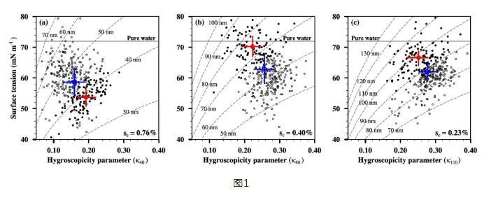 大氣氣溶膠作為云凝結(jié)核,通過與云的相互作用對氣候產(chǎn)生影響。氣溶膠活化為云滴,除了取決于氣溶膠的粒徑大小、化學(xué)成分和混合狀態(tài),更進(jìn)一步地,與氣溶膠的表面張力息息相關(guān)。大氣氣溶膠和云滴中廣泛存在著具有表面活性的有機物,它們可以減小氣溶膠活化時的表面張力,降低粒子增長的能量壁壘,使氣溶膠更容易被活化為云滴,從而增加云滴數(shù)濃度。本次研究結(jié)果表明:有機物顯著降低了污染大氣中氣溶膠的表面張力。