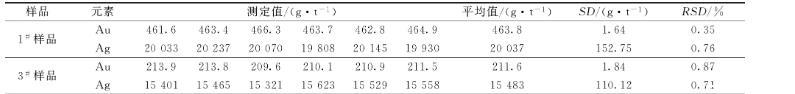 選取兩個(gè)粗鉍樣品,1#和3#樣品進(jìn)行實(shí)驗(yàn),稱取2.000 g粗鉍樣品,按照以上實(shí)驗(yàn)方法進(jìn)行實(shí)驗(yàn),每個(gè)樣品做了6次平行實(shí)驗(yàn),結(jié)果如表7所示,金相對標(biāo)準(zhǔn)偏差(RSD)為0.35%~0.87%,銀相對標(biāo)準(zhǔn)偏差(RSD)為0.76%~0.71%。