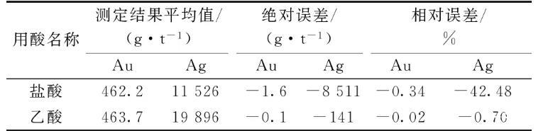 實(shí)驗(yàn)樣品金含量463.8 g/t,銀含量20 037 g/t,進(jìn)行除鉍用酸量的實(shí)驗(yàn),試驗(yàn)用酸為乙酸(1+1),結(jié)果見表5,從結(jié)果可以看出50、100 mL乙酸用量,大部分固體物質(zhì)沒被溶解,大部分鉍沒被除去,乙酸用量200 mL時(shí),固體物質(zhì)基本被溶解,結(jié)果較準(zhǔn)確,可以滿足測定要求。在結(jié)果準(zhǔn)確的情況下選擇用量少的,所以實(shí)驗(yàn)選擇乙酸用量為200 mL。
