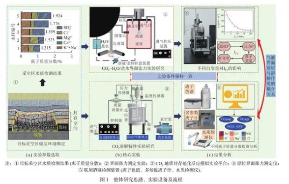 首先,通過原位界面張力測(cè)定儀開展的實(shí)驗(yàn)揭示了不同溫壓條件下CO2與地層水系統(tǒng)間的界面張力(IFT)變化規(guī)律。研究發(fā)現(xiàn),儲(chǔ)層壓力的增加會(huì)導(dǎo)致IFT顯著降低,而溫度升高時(shí),IFT會(huì)略有上升。此外,礦化度的增加會(huì)導(dǎo)致IFT增高,特別是在高溫、高礦化度的環(huán)境中。不同的陽離子溶液類型對(duì)CO2與鹽溶液之間的IFT也有顯著影響,表現(xiàn)出隨陽離子價(jià)態(tài)的升高而增大的趨勢(shì)。