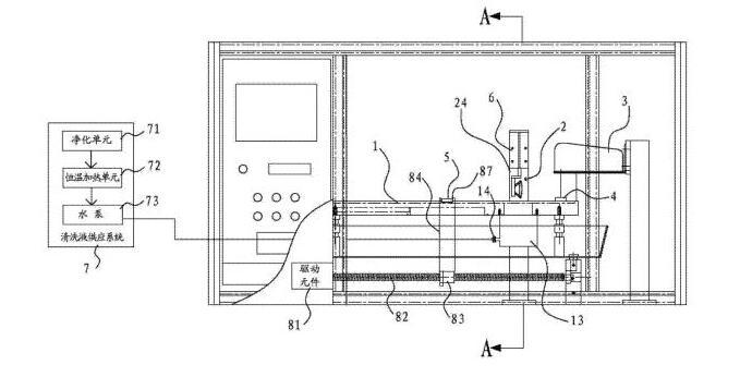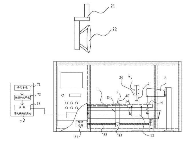[0018]在一些實施方式中,還包括清洗液供應系統(tǒng),清洗液供應系統(tǒng)包括凈化單元、恒溫加熱單元和泵體。清洗液通過凈化單元凈化并通過恒溫加熱單元進行加熱后,再經由泵體供應到清洗槽當中。其有益效果是,先通過凈化單元,可以預先清除掉清洗液當中可能存在的油。另外,通過恒溫加熱單元可以將清洗液加熱到一定的溫度。因為溫熱狀態(tài)的清洗液,可以實現(xiàn)更加的油脂清除能力,從而可以將樣品上的油更方便且更完全的清洗下來。