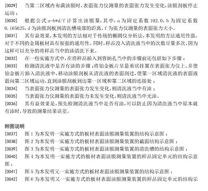 [0014]同時由于樣品固定單元是位于第一區(qū)域上方的,所以當油清洗下來的時候,首先是在第一區(qū)域的清洗液面擴散開來形成油膜。當油膜刮板從第一區(qū)域的一端向著第二區(qū)域方向運動的時候,油膜就會向第一區(qū)域運動,當?shù)谝粎^(qū)域內聚滿油膜的時候,表面張力儀就會通過鉑金板片感應到清洗液表面張力的變化,此時油油膜刮板停止運動,計算出整個油膜的面積。為了方便計算油膜的面積,可以在清洗槽的邊沿上設置相應的刻度,同時將油膜刮板設置成與清洗槽的邊沿相垂直。最后根據公式a-b*d/f計算出油膜量,其中,a為固定系數(shù)102.0,b為固定系數(shù)0.165625,d為油膜刮板到清洗槽端部的距離,f為張力儀測量的表面張力大小。