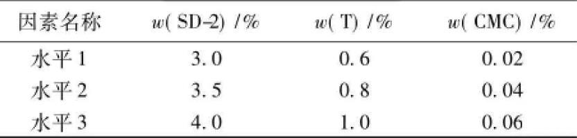 乳化劑SD-2,締合型增稠劑T和羧甲基纖維鈉等是CA砂漿陰離子乳化瀝青中最關(guān)鍵的3種組分,對(duì)乳化瀝青的性能起著決定性的影響。為了比較對(duì)油水界面張力和乳化瀝青貯存穩(wěn)定性的影響,采用L9(34)正交試驗(yàn)的方法進(jìn)行優(yōu)化設(shè)計(jì),因素水平見(jiàn)表1。