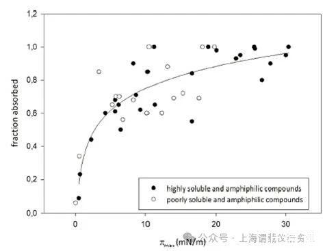 本論文研究人員提出了一種藥物活性分子生物利用度(fa)快速篩選方法-表面活性譜(SAP),作為替代傳統(tǒng)的動(dòng)物研究和細(xì)胞培養(yǎng)篩選。研究人員使用SAP技術(shù),主要是基于Kibron公司的高通量表面張力分析儀----(Delta-8),該儀器只需要50ul原液就能進(jìn)行完整的滲透率分析。并將溶液中化合物的表面活性譜化合物與生物膜相互作用或穿透生物膜的潛力聯(lián)系起來。用于這種關(guān)聯(lián)的進(jìn)一步參數(shù)包括臨界膠束濃度(CMC)、界面空氣/水分配系數(shù)(KAW?1)和分子在界面的面積要求,即截面面積(AS)等這些表面活性參數(shù)來獲取藥物的生物利用度(fa值)。此方法的提出對(duì)于先導(dǎo)化合物的早期篩選研究,因?yàn)橄葘?dǎo)化合物只有少量的化合物可用,SAP方法似乎是一個(gè)很有效和快速的工具,可以準(zhǔn)確預(yù)測(cè)兩親性化合物的fa值,為新藥研發(fā)提供了重要的技術(shù)支持,這也說明高通量的表面張力分析儀(delta-8)在藥物研發(fā)方面發(fā)揮了重要的作用,尤其是預(yù)測(cè)活性藥物分子的生物利用度(fa)提供了一種新的技術(shù)手段。