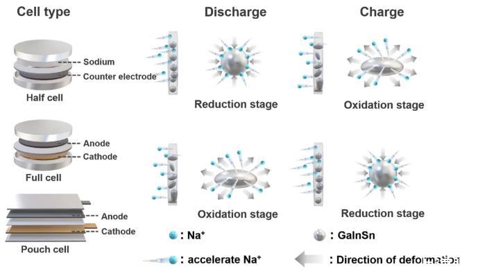 該工作闡述了液態(tài)金屬界面張力與電極電勢(shì)之間的關(guān)系,并闡明了電極電勢(shì)對(duì)Na+電化學(xué)傳輸速率的影響(圖1)。在還原反應(yīng)過程中,電極電勢(shì)降低,液態(tài)金屬的界面張力加快了Na+向內(nèi)的傳輸速率。在氧化反應(yīng)過程中,電極電勢(shì)增加,液態(tài)金屬表面電荷密度增大,界面張力下降,加快了Na+向外的傳輸速率。在此基礎(chǔ)上,為了加強(qiáng)液態(tài)金屬結(jié)構(gòu)穩(wěn)定性,構(gòu)筑液態(tài)金屬核殼包覆結(jié)構(gòu)(LMNCs),其自調(diào)節(jié)的界面張力有效改善了Na+傳輸動(dòng)力學(xué)過程。