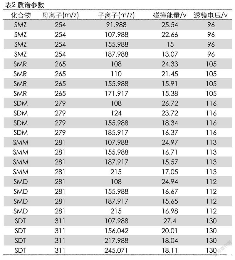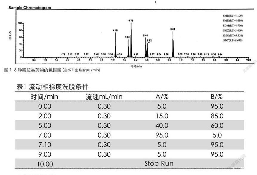 6種磺胺類標(biāo)準(zhǔn)物質(zhì):磺胺甲惡唑(SMZ)、磺胺甲基嘧啶(SMR)、磺胺間二甲氧嘧啶(SDM)、磺胺間甲氧嘧啶(SMM)、磺胺對甲氧嘧啶(SMD)、磺胺地索辛(SDT)(純度均大于99.5%,北京振翔科技有限公司);乙腈(色譜純,德國Merck公司);甲酸(色譜純,上海安普實(shí)驗(yàn)科技有限公司)。