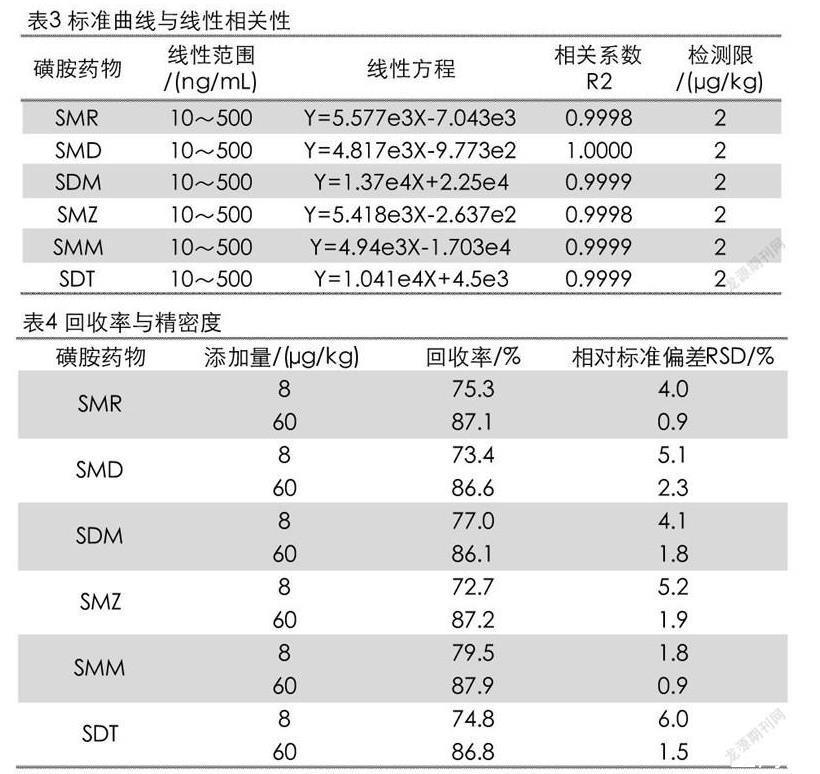 制備混合標(biāo)準(zhǔn)濃度系列,分別為10、50、100、250和500 ng/mL(分別相當(dāng)于被測組分的含量為2、10、20、50和100μg/kg)。將標(biāo)準(zhǔn)工作液按照2.3.3的方法進(jìn)樣測試。以進(jìn)樣濃度為橫坐標(biāo),以峰面積的響應(yīng)值為縱坐標(biāo)繪制標(biāo)準(zhǔn)曲線,結(jié)果如表3所。6種磺胺類藥物在濃度10~500 ng/mL范圍內(nèi)線性關(guān)系很好,相關(guān)系數(shù)R2≥0.9998。