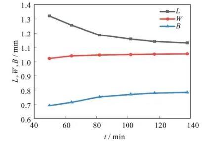 圖7為數(shù)值仿真過程中液滴三軸隨時(shí)間演化規(guī)律。綜合對比圖4和圖7,數(shù)值仿真軟件與實(shí)驗(yàn)過程中球形液滴的三軸長度變化趨勢基本一致。可以看出,在體積保持不變的假設(shè)下,球形液滴的第二半軸和第三半軸變形頻帶是不一致的。該結(jié)果表明一些黏彈性液滴的變形和收縮不嚴(yán)格符合仿射變形假設(shè)(即第三半軸W始終等于第二半軸B),這與文獻(xiàn)結(jié)果類似。數(shù)值仿真結(jié)果中液滴最終形態(tài)不是一個(gè)三軸長度相等的球形,主要原因是仿真過程中使用的非牛頓流體的本構(gòu)模型只對黏性項(xiàng)進(jìn)行了修改,而忽視了彈性應(yīng)力的影響,因此與理論計(jì)算結(jié)果有一定誤差。