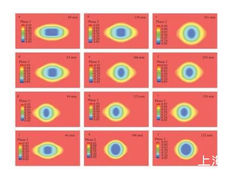 由計(jì)算流體力學(xué)后處理軟件所得到的液滴形態(tài)變化圖,可以看到液滴由最初的圓柱形變化成橢球形,再由橢球形變化成球形。與實(shí)驗(yàn)所得到的各時(shí)刻形態(tài)圖液滴變化趨勢相同,時(shí)間上略有誤差,可能是由于基質(zhì)導(dǎo)熱速率、加熱臺功率,以及室溫的影響。