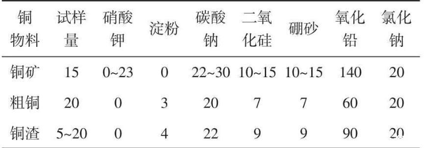 配料前可根據待測物組分確定熔渣的硅酸度,然后計算各熔劑的需要量。同時根據試樣還原力試驗結果(或理論計算試樣的還原力)調整氧化劑或還原劑加入量。通過優(yōu)選實驗,推薦含銅物料的配料可按表1進行。