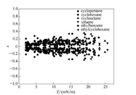 用于擬合的全部數(shù)據(jù)中,86.4%的數(shù)據(jù)的平均相對偏差在20%以內(nèi)。界面張力小于5 mN/m時,偏差較大。式(8)對于CO2-正構(gòu)烷烴/芳香烴/不帶支鏈的環(huán)烷烴/芳香烴體系的擬合結(jié)果較好,對于CO2-帶支鏈環(huán)烷烴體系擬合結(jié)果相對較差。