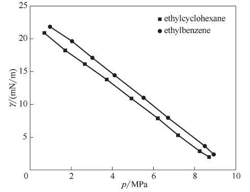 為探究相同碳原子數(shù)、不同結(jié)構(gòu)的影響,選取60℃下CO2-乙基環(huán)己烷/乙苯體系進行比較。由圖7可以看出,兩種體系的界面張力下降趨勢基本相同,但CO2-乙苯的界面張力略高于CO2-乙基環(huán)己烷體系。姬澤敏等、Nagarajan等曾對CO2-苯/環(huán)己烷體系的界面張力進行過測定,發(fā)現(xiàn)兩種體系界面張力隨壓力變化的等溫線幾乎重合,而CO2-乙基環(huán)己烷/乙苯體系界面張力差異明顯。從分子層面考慮,這是由于乙苯的極性比乙基環(huán)己烷大,從而導(dǎo)致乙苯分子間的相互作用更強,處于界面層的乙苯分子更難擴散到CO2中去,使得CO2-乙苯體系的界面張力大于CO2-乙基環(huán)己烷體系。