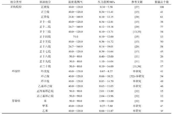 2.4.2實驗數(shù)據(jù)回歸及模型參數(shù)的求取本研究系統(tǒng)收集了文獻數(shù)據(jù),并將研究測定的實驗數(shù)據(jù),共計932個數(shù)據(jù)用于回歸,回歸所用數(shù)據(jù)見表2。回歸參數(shù)由最小二乘法得到,其目標(biāo)函數(shù)如式(9)所示。采用平均相對偏差(AARD)和均方根誤差(RMSE)表示計算效果,如式(10)、式(11)所示。回歸結(jié)果見表3。