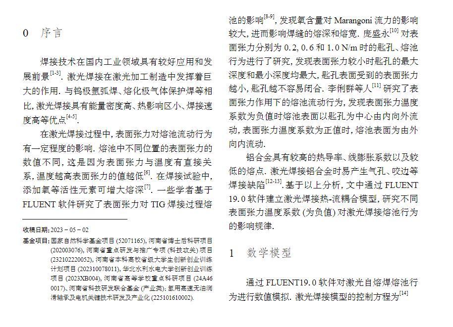 基于FLUENT19.0軟件,建立了激光焊接熱-流耦合模型,對比分析了不同表面張力溫度系數(shù)(為負(fù)值)對熔池流場的影響。