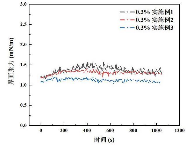采用克呂士SDT旋轉(zhuǎn)滴界面張力儀分別測量原油(粘度723.7 mPa·s)滴入各實施例的地層水溶液后的界面張力(IFT),其中,各實施例在地層水中的質(zhì)量濃度為0.3%,并將原油滴入地層水中作為對照組進行測量,測得對照組界面張力為21.6mN/m,其余各實施例測量結(jié)果如圖所示。可以看到,原油與三種實施例溶液混合后的體系的IFT可降低至1.25~1.46mN/m,證明了硅基納米原位乳化減阻劑具有良好的界面張力降低效果。