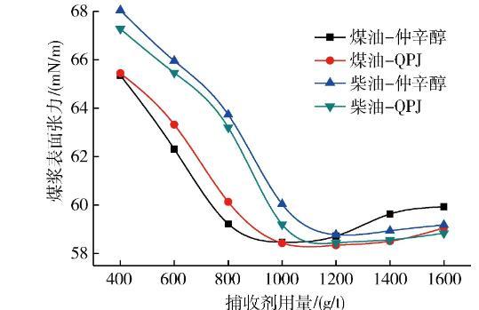 使用QPJ做起泡劑時(shí),煤漿表面張力在煤油用量為1000 g/t時(shí)達(dá)到最低值,在煤油用量超過1400 g/t后開始明顯回升;煤漿表面張力在柴油用量達(dá)到1200 g/t時(shí)達(dá)到最低值,在超過1400 g/t后開始回升。由此可見,捕收劑對煤漿的表面張力有著較為顯著的影響。