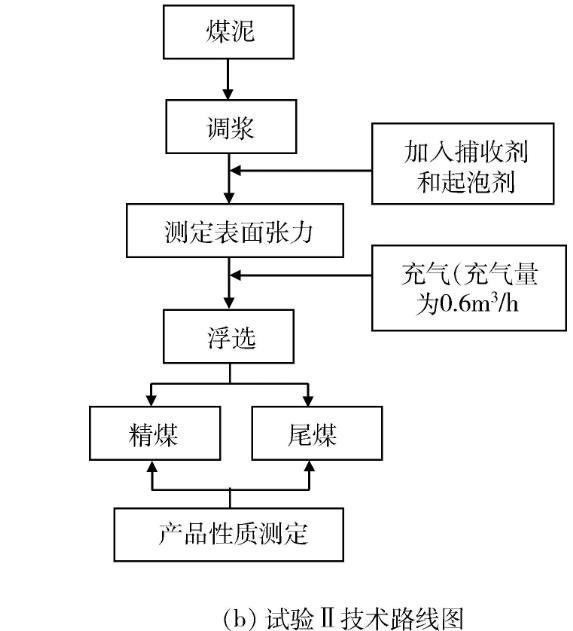 試驗(yàn)分為試驗(yàn)Ⅰ和試驗(yàn)Ⅱ兩部分。在試驗(yàn)Ⅰ中,先后改變捕收劑和起泡劑用量,對添加浮選藥劑后煤漿的表面張力進(jìn)行測定,以研究浮選藥劑用量對煤漿表面張力影響的規(guī)律。在試驗(yàn)Ⅱ中選用煤油/仲辛醇做捕收劑/起泡劑,先后改變煤油和仲辛醇的用量,按照《GB/T 4757-2013煤粉(泥)實(shí)驗(yàn)室單元浮選試驗(yàn)方法》對馬蘭2#煤泥進(jìn)行浮選試驗(yàn),并在浮選充氣前對煤漿同步進(jìn)行表面張力的測定,進(jìn)一步對浮選過程中浮選藥劑量、煤漿表面張力及浮選效果之間的關(guān)系進(jìn)行探索。試驗(yàn)控制煤漿濃度為100 g/L,溫度為22±0.2℃;使用一次去離子水(pH值為7.0±0.2)。試驗(yàn)技術(shù)路線見圖1。