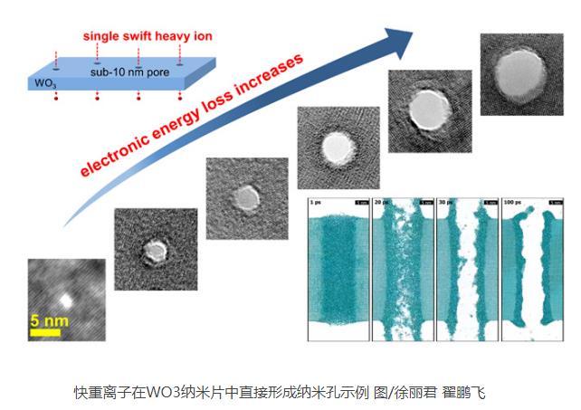 科研人員基于蘭州重離子研究裝置(HIRFL),利用快重離子作用于WO3納米片材料,實(shí)現(xiàn)了直接“打孔”的制備方法。同時,科研人員利用分子動力學(xué)模擬對物理機(jī)理進(jìn)行解釋,發(fā)現(xiàn)重離子在材料中的沉積能量會引起材料局域瞬時熔融噴發(fā),以及熔融相的粘度和表面張力大小是決定納米孔形成的關(guān)鍵因素。