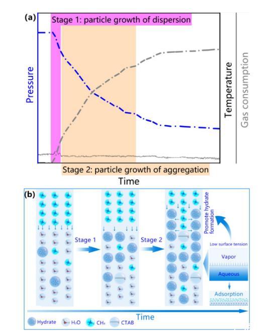 結(jié)合微觀與宏觀尺度的實(shí)驗(yàn)結(jié)果,該研究總結(jié)出兩階段水合物生長模式——第一階段為顆粒分散生長過程、第二階段為顆粒聚集生長過程(圖2)。