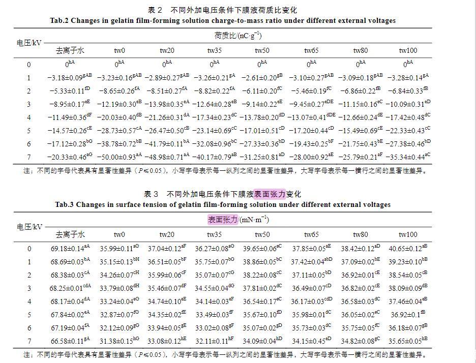 隨著膜液中吐溫20的減少和司盤(pán)20的增多,明膠液滴荷質(zhì)比亦呈增高趨勢(shì)(<0.05)。張建桃等[13]研究表明,介質(zhì)的電導(dǎo)率改變會(huì)引起其荷電性能的改變。相同質(zhì)量濃度下司盤(pán)20的物質(zhì)的量濃度更高,導(dǎo)致溶液電導(dǎo)率及液滴荷質(zhì)比增加更為明顯。然而,與只添加吐溫20的明膠溶液(tw100)相比,少量司盤(pán)20的添加(tw80)還會(huì)引起荷質(zhì)比的顯著減少(<0.05),推測(cè)這是由于溶液中吐溫20與司盤(pán)20分子通過(guò)“經(jīng)典疏水作用”在水溶液中優(yōu)先結(jié)合,從而使溶液中總?cè)苜|(zhì)相對(duì)濃度下降導(dǎo)致[14]。