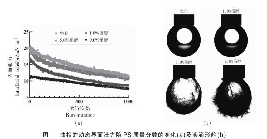 界面張力的測定參考許楊楊等的方法并有所修改,將不同質(zhì)量分數(shù)的PS(1.0%,5.0%,9.0%)溶解于玉米油中,使用超純水作為水相,研究PS濃度對油水間界面張力的影響。檢測系統(tǒng)為OCA20視頻光學接觸角測量儀。