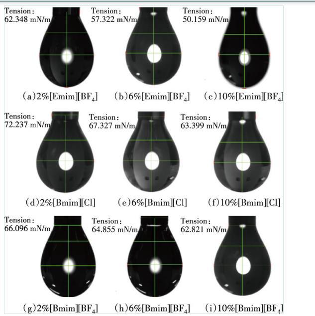 1)表面張力測試。在室溫為25℃的環(huán)境中,利用電子天平將[Emim][BF4]、[Bmim][Cl]、[Bmim][BF4]分別配制質(zhì)量分?jǐn)?shù)為0.6%、0.7%、0.8%、0.9%、1%、2%、3%、4%、5%、6%、7%、8%、9%、10%的活性水溶液,測定不同質(zhì)量分?jǐn)?shù)下離子液體溶液的表面張力3次,取平均值。