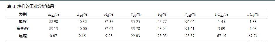選取不同變質(zhì)程度的褐煤、焦煤及長焰煤,將煤樣放入球磨機(jī)中粉碎,并通過篩網(wǎng)過濾出粒徑在0.074 mm(200目)以上的煤粉,置于45℃真空干燥箱中干燥24 h后放入密封袋中低溫、避光保存。利用全自動(dòng)工業(yè)分析測定儀對(duì)3種煤樣的水分、灰分和揮發(fā)分進(jìn)行測定,計(jì)算固定碳,其工業(yè)分析結(jié)果如表1所示。