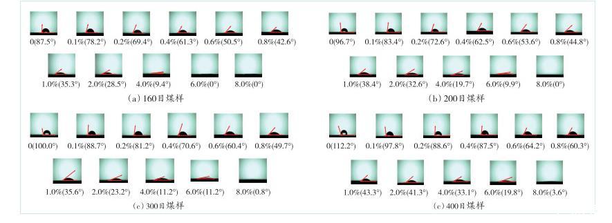 圖4不同質(zhì)量分?jǐn)?shù)EMI的溶液潤濕煤塵接觸角成像圖