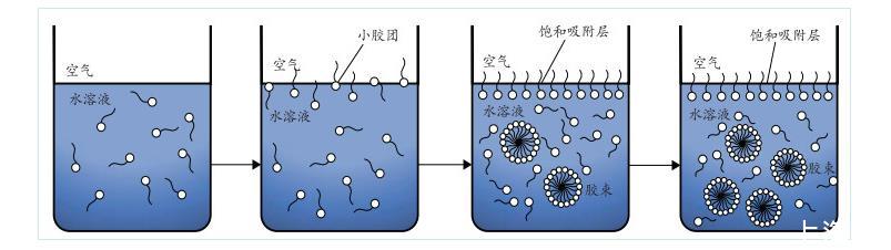 由圖2可知,隨著溶液中EMI質(zhì)量分?jǐn)?shù)的增大,表面張力持續(xù)降低。當(dāng)溶液中EMI質(zhì)量分?jǐn)?shù)大于0.6%后,表面張力的變化趨勢逐漸變緩,幾乎維持在同一水平。出現(xiàn)這種現(xiàn)象的主要原因在于加入溶液中的EMI會對溶液的表面張力產(chǎn)生重要影響。EMI分子本身具有兩親性質(zhì),其中有機(jī)高分子會在溶液的表面形成吸附,并在液面定向排列,使疏水基擴(kuò)展于空氣中,親水基則與水面吸附,溶液中EMI分子吸附狀態(tài)隨其質(zhì)量分?jǐn)?shù)變化情況如圖3所示。吸附于水面的EMI分子達(dá)到飽和狀態(tài)時,EMI溶液的膠束質(zhì)量分?jǐn)?shù)便達(dá)到臨界值,EMI分子開始締合逐步形成膠束聚集物,該質(zhì)量分?jǐn)?shù)即為溶液的CMC值。之后,繼續(xù)加入EMI溶液,表面張力不再發(fā)生較大波動,溶液內(nèi)逐漸締合成更多穩(wěn)定的膠束。