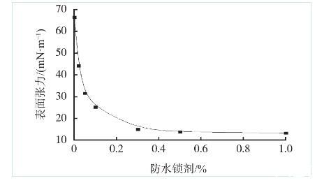 室溫下,3%NaCl鹽水溶液中分別加入不同濃度的防水鎖劑FS-1,評價(jià)FS-1加量對鹽水溶液表面張力的影響。