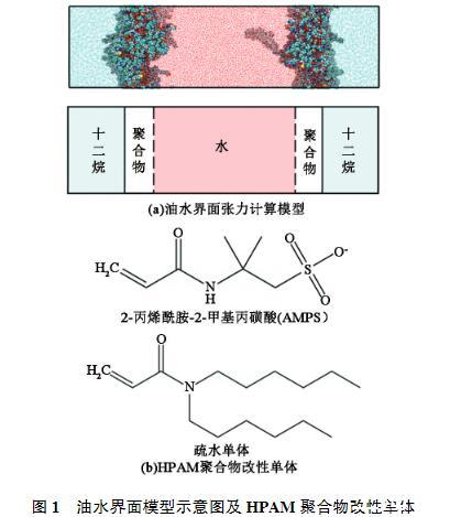 為研究聚合物對油水界面張力的影響,模擬體系由油相、水相、聚合物分子3部分組成,模型見圖1(a)。其中油相由正十二烷分子來模擬,聚合物選擇HPAM以及改性后的聚丙烯酰胺進(jìn)行對比研究。