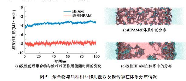 界面張力來自于界面處分子受到的應力不均衡,因此需要增加兩相之間的聯(lián)系,從而減少界面張力。由于HPAM分子本身親水,與水相具有較強的相互作用,因此主要考察HPAM和油相之間的相互作用強度。圖5(a)為HPAM和改性HPAM與油相的相互作用能隨時間的變化。可以看出,HPAM在0~100 ns的模擬過程中相互作用強度逐漸降低,說明部分HPAM從油水界面處脫離進入水相。由圖5(b)也看出HPAM分子大量均勻分布在水相中,其主要原因也是缺少親油基團,不易在界面處穩(wěn)定存在,更傾向于溶解于水中。而引入疏水基團改性后的HPAM與油相的相互作用能明顯強于HPAM與油相的作用能。由圖5(c)看出改性HPAM大多數分布在油水界面附近。改性HPAM在界面處橋接了油相與水相,緩解了界面處分子應力不均衡,從而起到降低界面張力的效果。