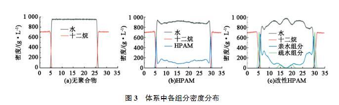 聚合物改變油水界面張力的本質是油水界面特征的改變,為此分析各個組分在體系中的密度分布情況,結果見圖3。可以看出,在沒有聚合物的情況下,油水界面非常清晰,油相和水相處于完全分離的狀態(tài)。加入HPAM后,油相的分布幾乎沒有變化,而界面處水相密度變化的斜率略有減少,說明HPAM主要分布在水相中,在一定程度上減少了界面上水分子的數量。但由于HPAM和油相之間的相互作用較弱,因此并沒有改變油相在界面附近的分布情況。改性HPAM的加入對油水兩相的密度分布影響都較大,界面處油相密度變化的斜率減小,說明親油組分和油分子相互融合,從密度分布還可以看出由于聚合物的加入,油相和水相被聚合物顯著分離。