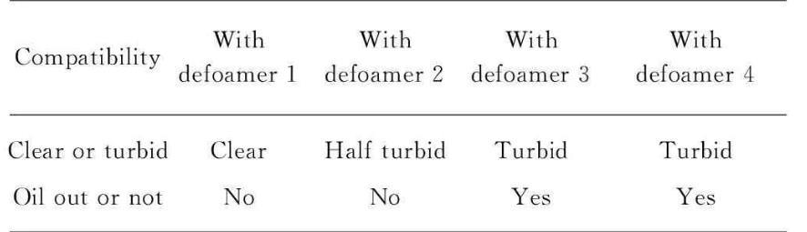 消泡劑的消泡能力與乳液的相容性成反比關(guān)系。消泡劑1和2與乳液的相容性最好,但因為部分溶解于乳液中,使消泡強(qiáng)度減弱;而消泡劑4與乳液的相容性最差,雖然具有極強(qiáng)的消泡性,但是因為過于疏水而難與乳液相容,所以容易造成表面缺陷。消泡劑3與乳液的相容性與消泡能力較為平衡,是最佳的消泡劑選擇。