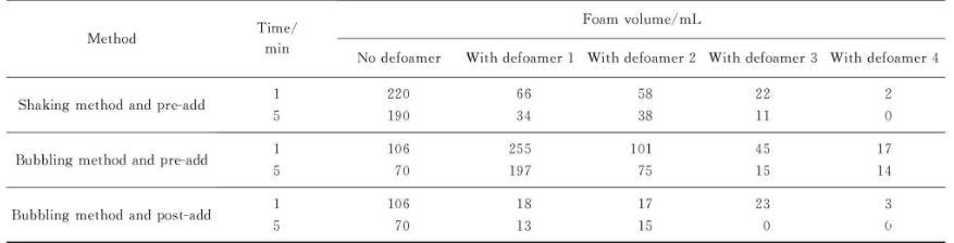 用鼓氣法研究了不同的消泡劑添加方式,由表1可以發(fā)現(xiàn)后添加方式比先添加方式的初始泡沫明顯降低。后添加方式的消泡劑大量聚集于泡沫表面,破壞了氣液界面的平衡。雖然在實際生產(chǎn)過程中以先添加方式為主,但試驗結(jié)果給出了制備工藝改進(jìn)的思路。