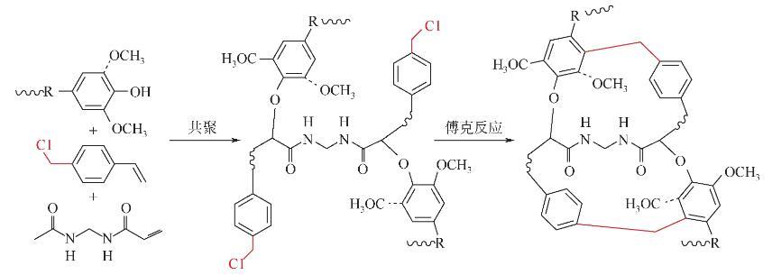 以上文獻(xiàn)表明木質(zhì)素基多孔聚合物作為吸附劑擁有巨大潛力,但目前報(bào)道的木質(zhì)素基聚合物的比表面積仍相對(duì)較小,且多為介孔大孔結(jié)構(gòu),雜原子含量不高,吸附性能仍有待提高。此外,將其應(yīng)用于放射性碘捕獲也很少有文獻(xiàn)報(bào)道。基于此,本文擬采用多步化學(xué)交聯(lián)策略,即先通過(guò)自由基共聚反應(yīng)接枝一定量的可烷基化或酰基化基團(tuán)的芳香族單體,且聚合中加入少量含雜原子的雙烯單體,使其得到理想的親疏水性以及充足的碘親和位點(diǎn)。接著,通過(guò)Friedel-Crafts反應(yīng)使上述內(nèi)親電試劑在木質(zhì)素共聚物的大分子鏈之間搭建大量由亞甲基等剛性基團(tuán)形成的交聯(lián)橋,原位構(gòu)筑剛性結(jié)構(gòu)支撐的雜原子修飾木質(zhì)素基超交聯(lián)聚合物,從而保證其對(duì)碘蒸氣或碘溶液具有快速的吸附速率、良好的穩(wěn)定性和高的吸附容量。