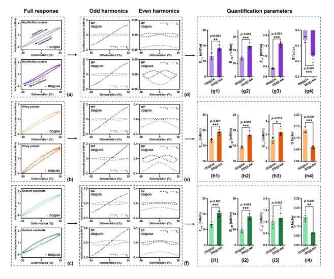 圖5.非線性粘彈區(qū)域內(nèi)(振幅30%),不同飽和度界面上(a)MP,(b)WP和(c)SC界面膜的利薩茹圖像;通過(guò)GSD算法得到的(d)MP,(e)WP和(f)SC利薩茹圖像的τ1,τ2,τ3,τ4分解組分;根據(jù)τ1,τ2,τ3,τ4計(jì)算得到的(g1-g4)MP,(h1-h4)WP和(i1-i4)SC的Eτ1L,Eτ1M,Eτ4模量與S-因子。*p<0.05,**p<0.01,***p<0.001